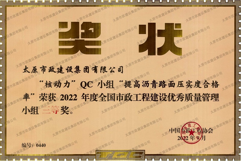 資質(zhì)證書 營(yíng)業(yè)執(zhí)照 2022年度市政工程最高質(zhì)量水平評(píng)價(jià)_H5-1路道路及配套工程(二標(biāo)段) 2022年度工程建設(shè)誠(chéng)信典型企業(yè) 中國(guó)施工企業(yè)管理協(xié)會(huì)_AAA級(jí)企業(yè)信用等級(jí) 2022年度全國(guó)市政工程建設(shè)優(yōu)秀質(zhì)量管理小組三等獎(jiǎng)_''核動(dòng)力QC小組”提高瀝青路面壓實(shí)度合格率”